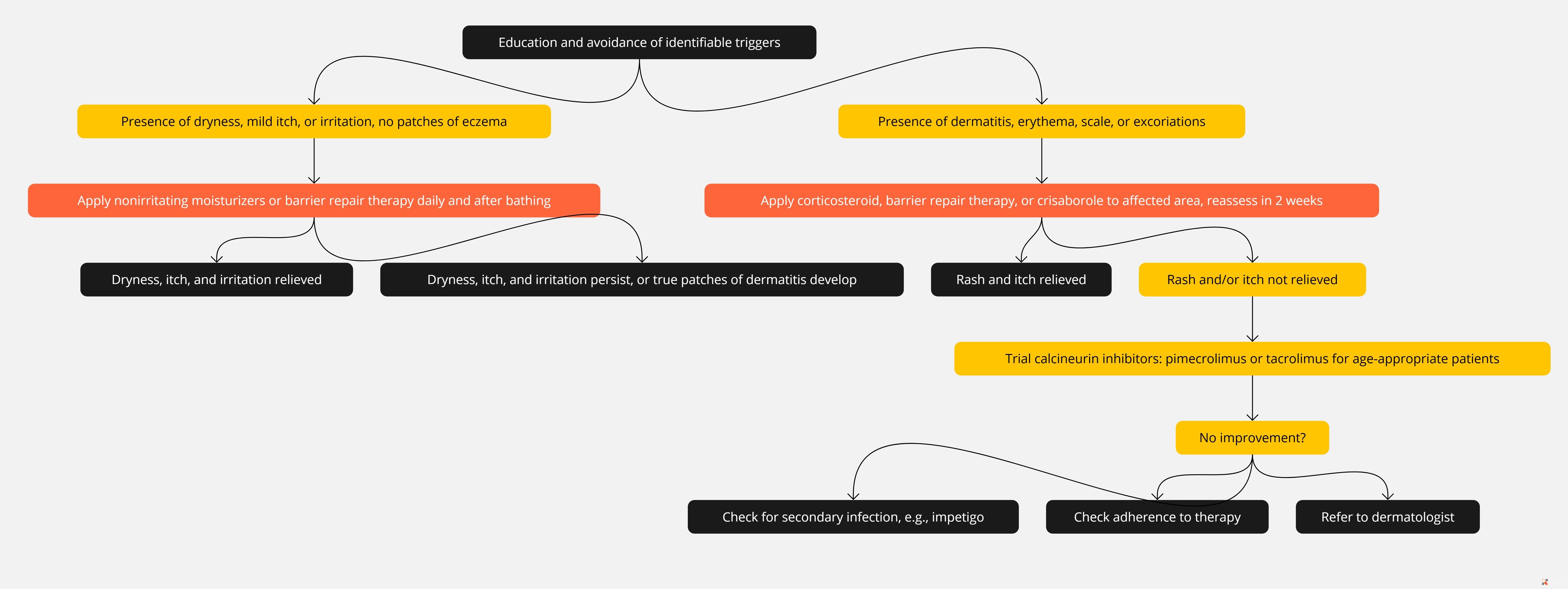 Moisturizers and topical corticosteroids remain the primary treatments. Potent corticosteroids should be used sparingly to minimize systemic absorption.